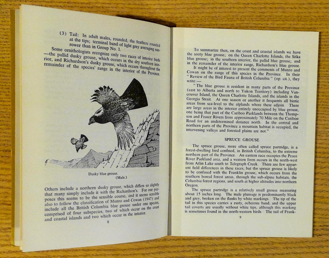 Book is in excellent condition. Binding is solid and square, covers have sharp corners, exterior shows no blemishes, text/interior is clean and free of marking of any kind. Small format, 47 pages, with sections on Blue grouse, franklin grouse, ruffled grouse, willow ptarmigan, rock ptarmigan, White-tailed grouse, sage hen, euorpean grey partridge, chukar partridge, bob-white quail, california quail, mountain quail, ring-necked phesant, etc. Illustrated with large black and white drawings throughout, map at front.