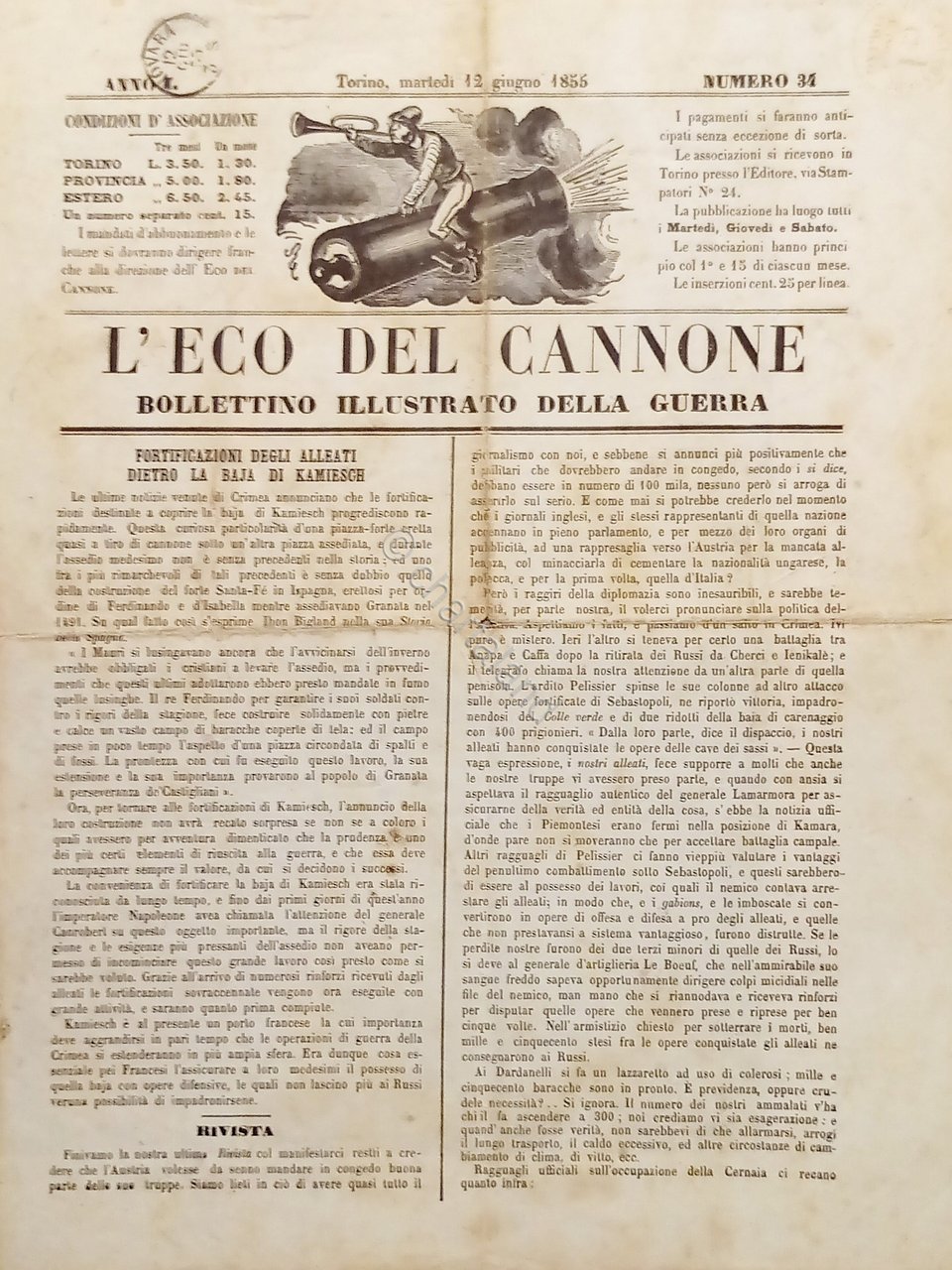 Bollettino Illustrato della Guerra - L'Eco del Cannone N. 34 - Anno I - 1855 Testo in lingua italiana. Pagine 4 con illustrazioni. Condizioni discrete/buone con segni del tempo come da foto.