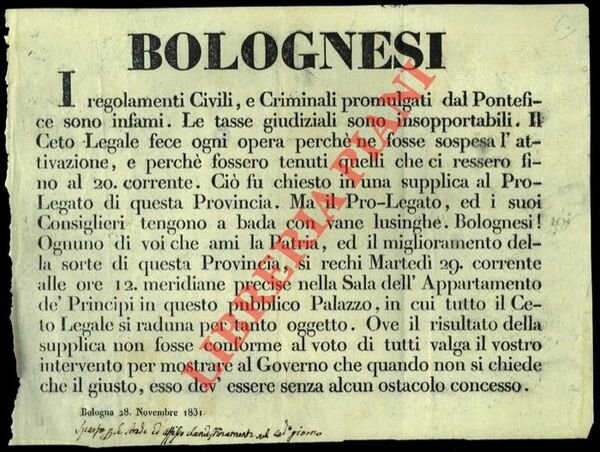 Bolognesi. Il. Ceto Legale si riunirà martedì 29 alle ore 12 meridiane, nella Sala dell'Appartamento dè Principi in questo pubblico Palazzo. " I Regolamenti Civili e Criminali promulgati dal Pontefice sono infami. Le tasse giudiziali insopportabili. " | Libri antichi e moderni |