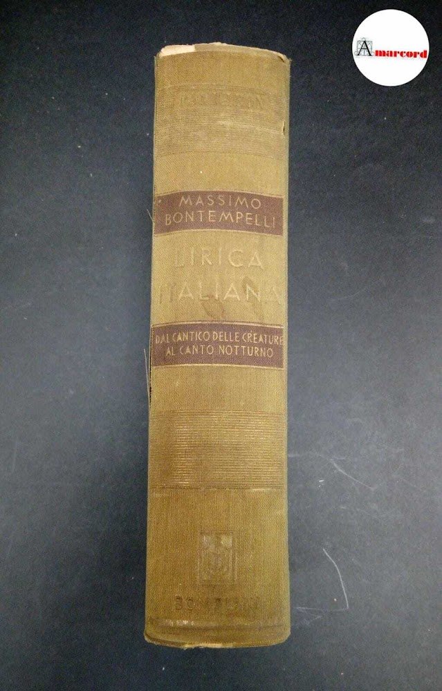935 a cura di Massimo Bontempelli Bontempelli, Massimo. Lirica italiana : dal cantico delle creature al canto notturno d'un pastore errante dell'Asia. Milano Bompiani, 1944. Milano, Bompiani 1944 italiano, in ottavo XVI, 725 p., 112 p. di tav 6559