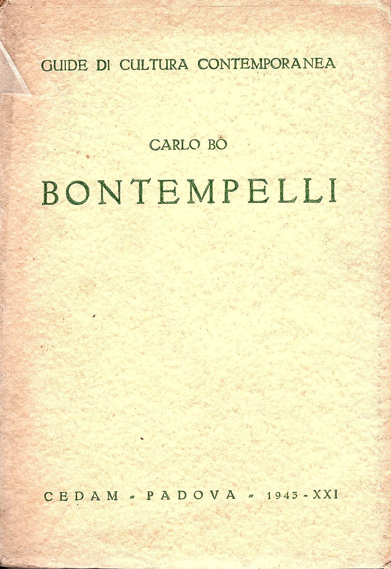In-16°(19.5x13.5 cm), pp. 57, (3), brossura editoriale a risvolti paratestuali protetta da velina con titoli in nero al dorso e al piatto anteriore. Guide di cultura Contemporanea, Perfetto esemplare entro velina. Edzione originale di questo studio critico sull'opera di Massimo Bontempelli. Nota biobibliografica.