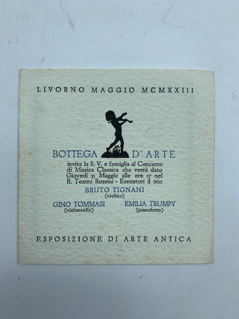 Pieghevole di 4 facciate (ciascuna misura cm 12 x 12) con invito al concerto di musica classica, tenutosi il 31 maggio 1923 presso la Galleria Bottega d'Arte di Livorno, con la partecipazione del trio Bruto Tignani (violino), Gino Tommasi (violoncello), Emilia Trumpy (pianoforte). All'interno programma del concerto.