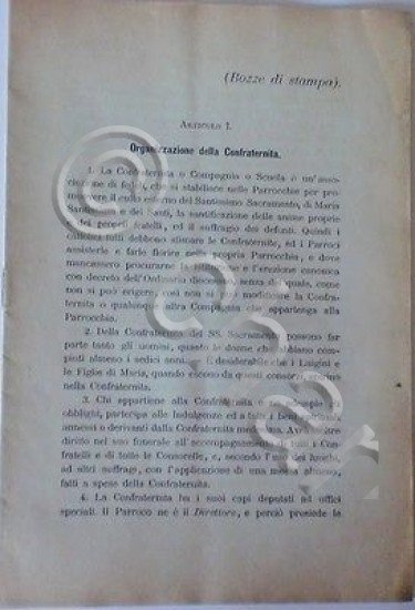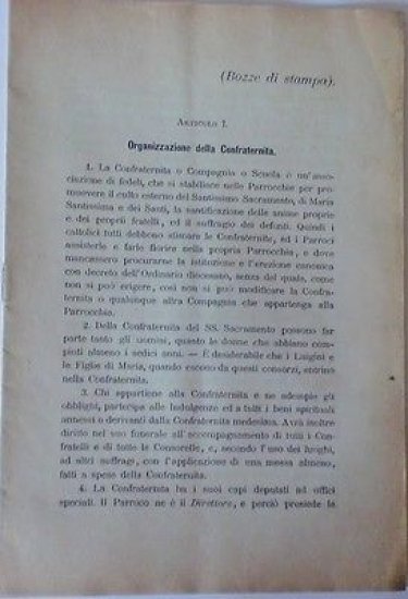 *** Bozze di Stampa - Articolo I: Organizzazione della Confraternita - Articolo II: Accettazione dei Confratelli - Articolo III: Doveri dei Confratelli - Articolo IV: Dell'elezione degli Officiali - Articolo V: Delle Funzioni - Articolo VI: Dell'Amministrazione - Articolo VII: Pagamenti e Suffragi - Inscrizione del Confratello o della Consorella - Indulgenze - 1^ ed. , pp. 18Interessante pubblicazione, fonte ricchissima di informazioni e curiosità per appassionati, studiosi e collezionisti