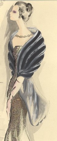Bozzetto sartoriale. Abito lungo da sera con stola di pelliccia. | Libri antichi e moderni | Anonimo.