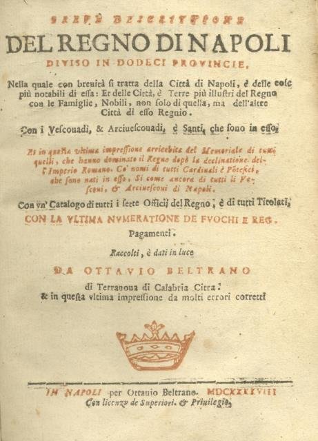 BREVE DESCRITTIONE DEL REGNO DI NAPOLI DIVISO IN DODECI PROVINCIE. Nella quale con brevità si tratta della città di Napoli, e delle cose più notabili di essa. Et delle Città, e Terre più illustri del Regno, con le Famiglie, Nobili, non solo di quella, ma dell'altre Città di esso Regno. Con i Vescovadi, & Arcivescovadi, e Santi, che sono in esso. Et in questa ultima impressione arricchita del Memoriale di tutti quelli, che hanno dominato il Regno dopo la declinatione dell'Imperio Romano. Co' nomi di tutti Cardinali, e Pontefici, che sono nati in esso, si come ancora di tutti li Vescovi, & Arcivescovi di Napoli. Con un Catalogo di tutti i sette Officij del Regno, e di tutti Titolati. Con la ultima numeratione de fuochi e Reg. Pagamenti.