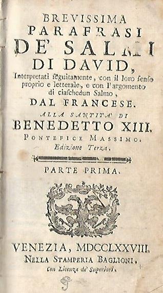 Brevissima parafrasi de salmi di David interpretati seguitamente con il loro senso proprio e letterale e con l'argomento di ciaschedun salmo dal francese alla santità di Benedetto XIII | Libri antichi e moderni | ,