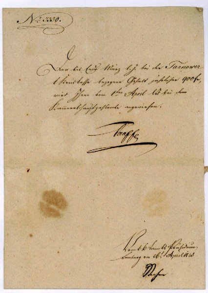 Vier Zeilen auf Doppelblatt. Folio. Mit Adresse (Faltbrief). An Kreiskommissär Franz Krausz: "Der bis Ende März l. J. bei der Tarnower k. Kreiskasse bezogene Gehalt jährlicher 900 fr wird Ihnen vom 1ten April lJ bei dem Kammeralhauptzahlamte angewiesen [.]". - "Der edle Graf", so Wurzbach (zit. n. DBI I 1255, 49), "hatte seine öffentliche Tätigkeit in dem Richterstande begonnen. Zwölf Jahre hindurch war er in andere hochwichtige Stellungen der politischen und finanziellen Administration versetzt worden. Und in der vollsten Kraft des Mannesalters ward er der richterlichen Wirksamkeit wieder gegeben, in welcher er schon als Jüngling so rühmliche Erfolge errungen [.]". Von 1848 an "war er bis zu seinem Lebensende in Wahrheit Präsident des Obersten Gerichts- und Cassationshofes für den gesamten österreichischen Kaiserstaat. Der erste und einzige! [.]" (ebd., 51). - Papierbedingt etwas gebräunt und mit Resten eines papiergedeckten Siegels.