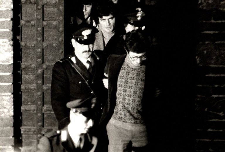 Pentito d'eccellenza della colonna romana delle BR, arrestato durante l'operazione condotta dai NOCS per liberare il generale della Nato Dozier, decide di diventare "collaboratore di giustizia" 3 giorni dopo il suo arresto. Nella foto viene condotto a processo a Verona. Al verso timbro dell'agenzia, un breve testo dattiloscritto e scritte a penna, in ottimo stato.