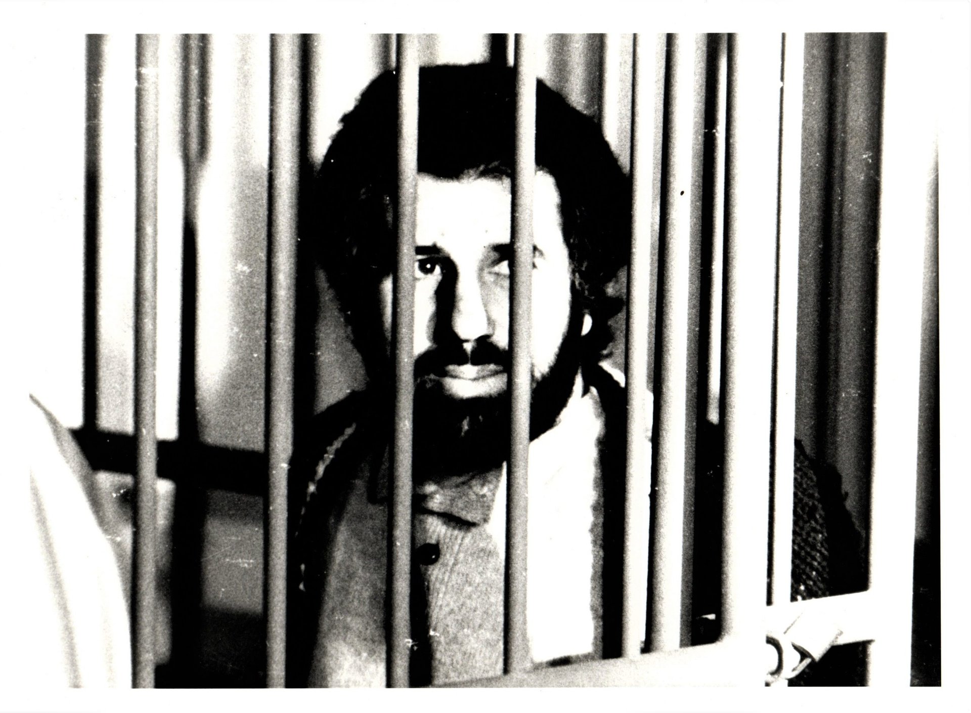 Ristampa di una foto degli anni '80: Curcio nella gabbia degli imputati durante un processo, al verso la descrizione dattiloscritta della foto, in ottimo stato.