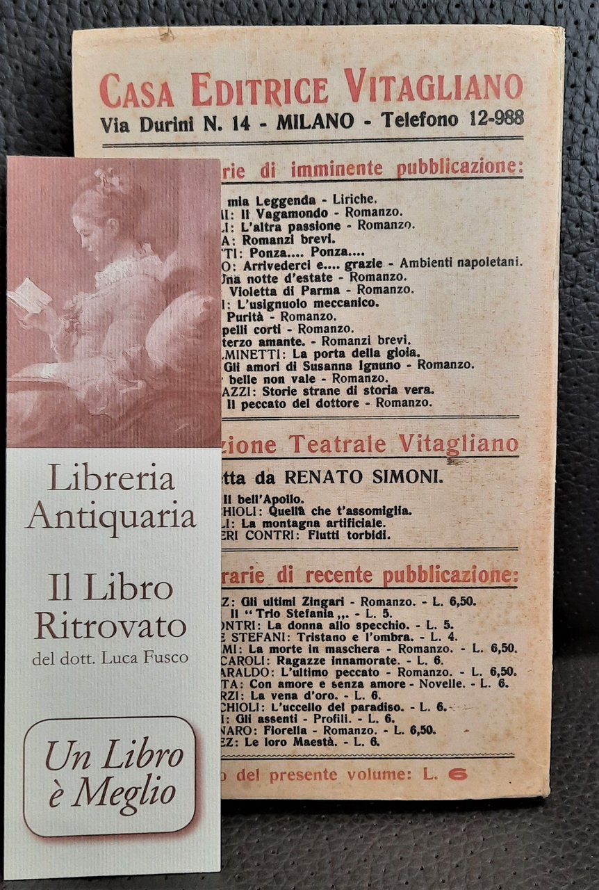 Raccolta di racconti. 3. Migliaio. Milano-Vitagliano, 1920 in 8° pp. 266. Bella cop. ill. a colori attaccata su cartoncino. Raro.