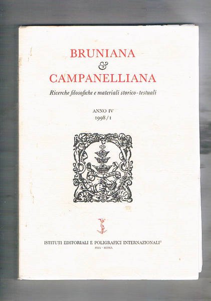 Bruniana & Campanelliana. Semestrale di Ricerche filosofiche e materiali storico-testuali. Anno IV, 1998, n° I-II°. Il concetto di ingenuo in Bruno; Bruno's Area Democriti and the origins of atomist imagery; appunti sulla diffusione della filosofia di Bruno nell'Olanda del '700; menzogna e nnichilazione in Tommaso Campanella; ecc.