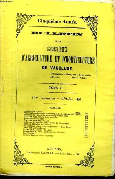 Bulletin de la Société d'Agriculture et d'Horticulture de Vaucluse. TOME 5 - 10ème Livraison