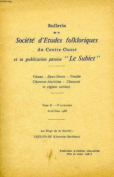 BULLETIN DE LA SOCIETE D'ETUDES FOLKLORIQUES DU CENTRE-OUEST ET SA PUBLICATION PATOISE 'LE SUBIET', TOME II, 6e LIV., AVRIL-JUIN 1966 | Libri antichi e moderni | Collectif