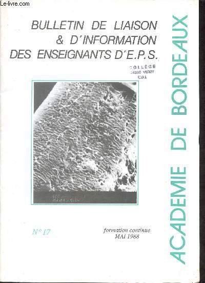 Bulletin de liaison & d'information des enseignants d'e.p.s. acad�mie de Bordeaux n�17 mai 1988 - Quand lyc�ens et �tudiantes interviewent le recteur - votre bulletin acad�mique de fpc-eps comment est il per�u ? - asthme � l'exercice chez l'enfant etc.