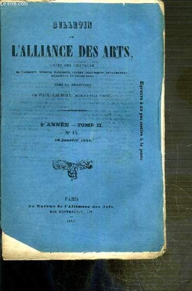 BULLETIN DES ARTS GUIDE DES AMATEURS DE TABLEAUX, DESSINS, ESTAMPES, LIVRES, MANUSCRITS. - 2eme ANNEE - TOME II - N°14 - 10 JANVIER 1844 - bibliotheque de M.de Soleinne, theatre latin moderne (2e article) - nouvelles et faits divers France. | Libri antichi e moderni | Lacroix Paul