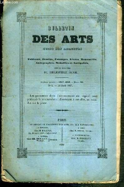 BULLETIN DES ARTS GUIDE DES AMATEURS DE TABLEAUX, DESSINS, ESTAMPES, LIVRES, MANUSCRITS. - 6eme ANNEE - 1847-1848 - TOME VI - N°2 - 10 AOUT 1847 - variétés, proces de Guttemberg, notices sur quelques manuscrits de la bibliotheque publique de Bordeaux. | Libri antichi e moderni | Collectif