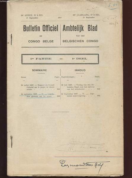 BULLETIN OFFICIEL DU CONGO BELGE. 30e ANNEE N�9 BIS. 25 SEPTEMBRE 1937. 1ERE PARTIE. RAPPORT DU CONSEIL COLONIAL SUR LE PROJET DE DECRET MINIER. | Libri antichi e moderni | Collectif