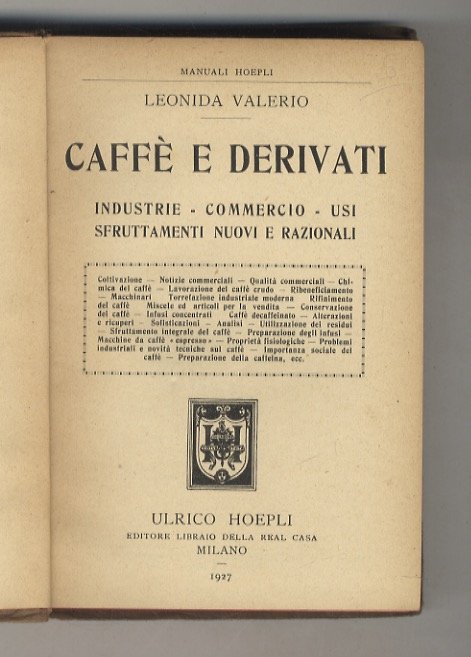 Caffè e derivati. Industrie - Commercio - Usi, sfruttamenti nuovi e razionali. (Coltivazione - Qualità commerciali - Chimica del caffè - Lavorazione del caffè crudo - Macchinari - Torrefazione industriale moderna - Miscele ed articoli per la vendita - Conservazione - Infusi concentrati - Decaffeinato - Sofisticazioni - Utilizzazione dei residui - Importanza sociale del caffè, ecc.). | Libri antichi e moderni | Valerio Leonida.