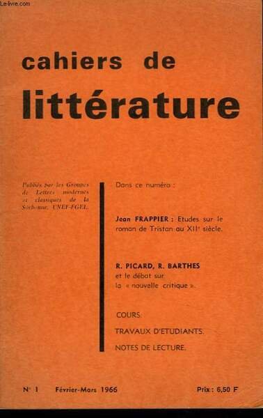CAHIERS DE LITTERATURE N°1, FEVRIER-MARS 1966. JEAN FRAPPIER: ETUDES SUR LE ROMAN DE TRISTAN AU XIIe SIECLE / R. PICARD, R. BARTHE ET LE DEBAT SUR LA "NOUVELLE CRITIQUE". / COURS / TRAVAUX D'ETUDIANTS / NOTES DE LECTURE.