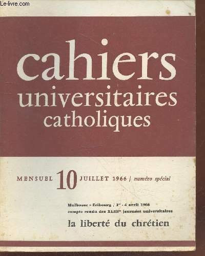 Cahiers Universitaires Catholiques n°10 Juillet 1966 numéro spécial. Sommaire :La révélation du Dieu libérateur par M. Parent - La parole, instauratrice de liberté par P. Ricoeur - L'Eglise institution de la liberté par J Gagey - Laïcité et liberté etc.
