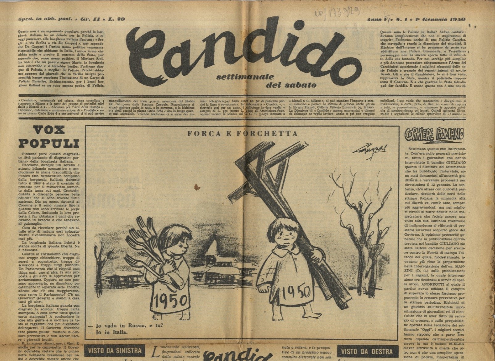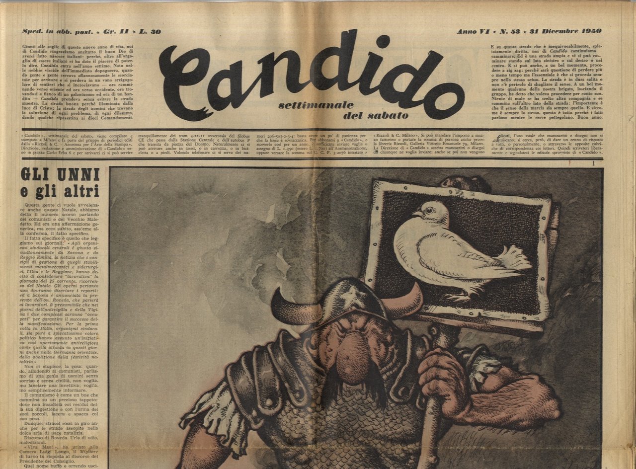 CANDIDO. Settimanale del sabato. Direttori: Giovanni Mosca e Giovannino Guareschi. Anno VI. 1950. Di questa annata disponiamo dei fascicoli: dal n. 1 al 31, dal 36 al 40, dal 42 al 44, dal 46 al 53.