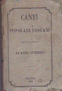 In-24°, pp. 367, brossura editoriale (con aloni e dorso restaurato). In barbe, con ingialliture. Seconda edizione, rara, della nota raccolta dell'Andreoli di canti popolari toscani; i canti raccolti sono per lo più a carattere amoroso. La prima edizione dell'antologia era apparsa a Napoli nel 1857. Lozzi, II, 5428 (con lunghe annotazioni sui criteri della raccolta). Pitrè, 1081.