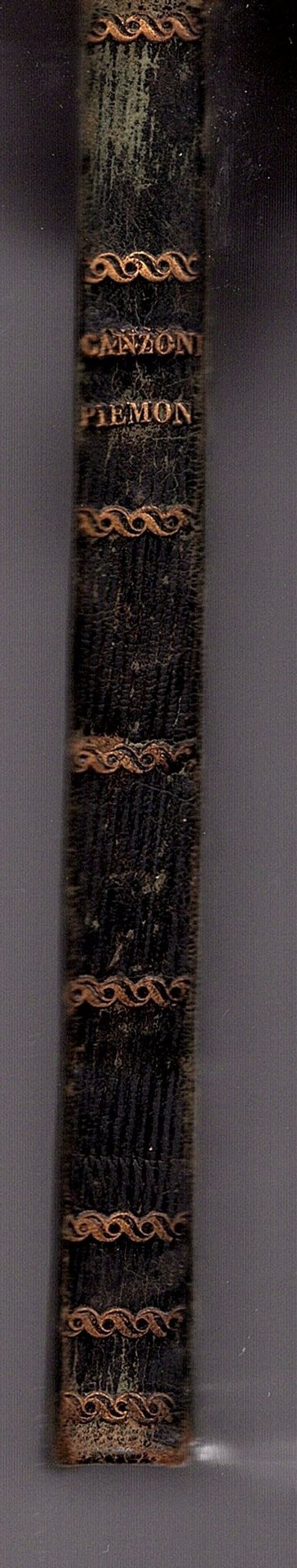 In-16° (16x10 cm), pp. 148, legatura coeva in pelle verde liscia con titolo e fregi dorati al dorso, piatti riquadrati da motivo ornato impresso e dorato. Carte lievemente arrossate, minimi difetti al contropiatto posteriore ma più che buon esemplare genuino. Edizione originale della celebre raccolta di canti piemontesi del Brofferio (Castelnuovo Calcea, 1802-Locarno, 1866). Parenti, IV, pp. 327-328.
