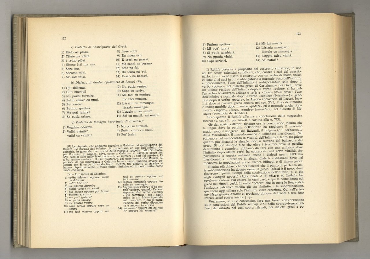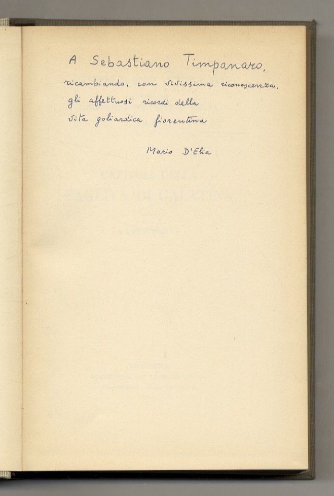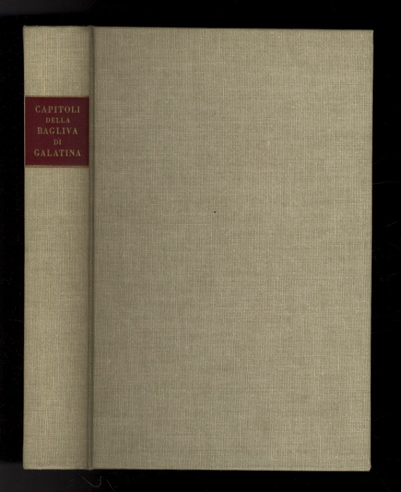 Bologna, Commissione per i testi di lingua, 1968, in-8, legatura editoriale in piena tela,titolo dorato su tassello al dorso, pp. XV, [1], 390, [2]. Si tratta della prima edizione a stampa di un codice pergamenaceo compilato negli anni 1496-1499, nel quale sono dettate disposizioni relative alla polizia campestre, disposizioni di ordine amministrativo, fiscale e di pubblica sicurezza: interpretano cioè le antiche consuetudini locali, che furono pubblicamente proclamate sullo scorcio del XV sec. nella città di S. Pietro in Galatina (oggi Galatina, in provincia di Lecce). "Collezione di opere inedite o rare pubblicate dalla Commissione per testi di lingua" n. 130. Invio autografo del curatore a Sebastiano Timpanaro sulla prima pagina bianca.