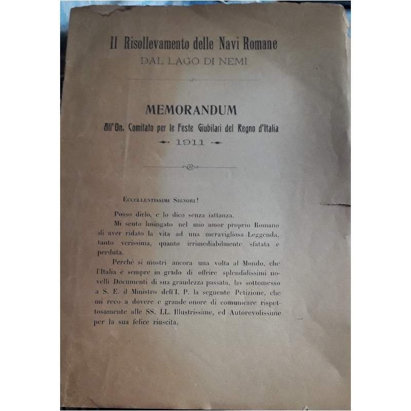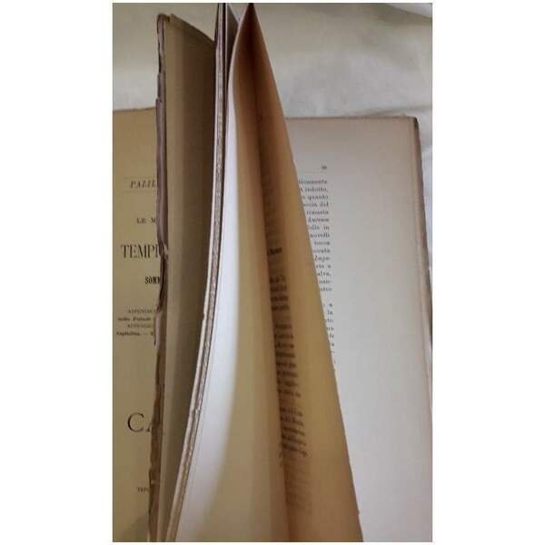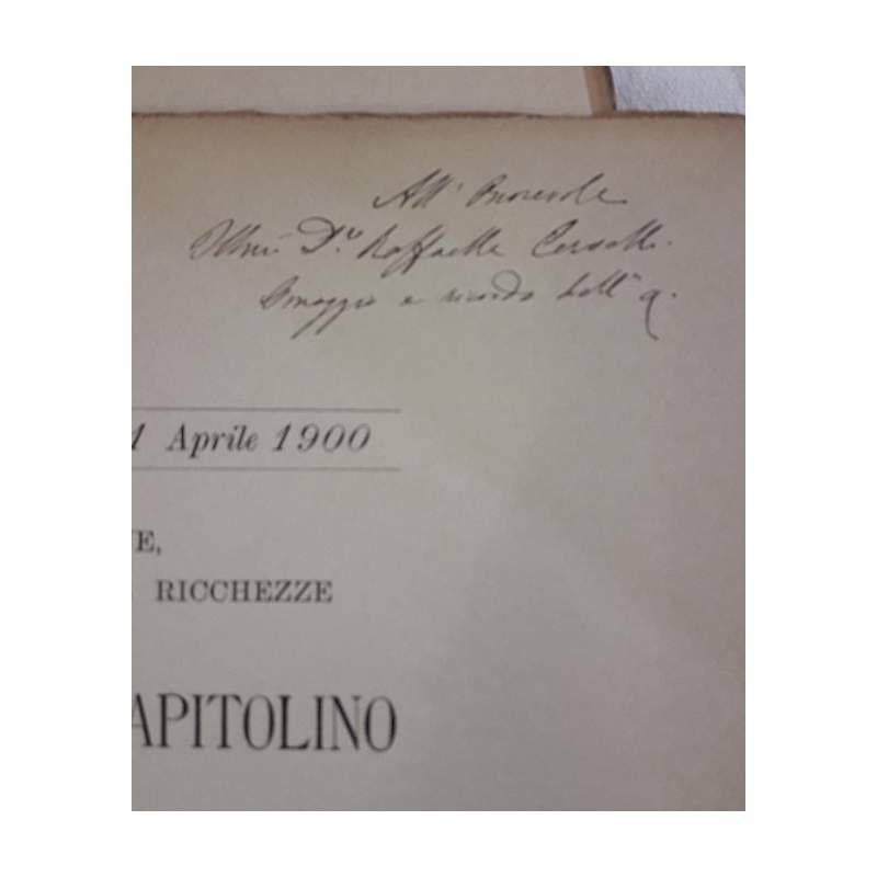 Tutte le rovine, le memorie storiche, le ricchezze del Tempio di Giove Capitolino(Capitolium) sommerse e giacenti nelle paludi d'Ostia In 4', br. ed. pp. 146, ; Estratto dall'Opera del medesimo(ancora inedita) Capitolium. Appendice I- -Gli avanzi di Roma incendiata sotto Nerone, sepolti nelle Paludi d'Ostia. appendice II- 1 Indagini nelle Favissae Capitolinae.- 2- Scavi nell'Area Capitolina.- 3- Escavazione della Substructio Capitolii. Conservato all'interno fascicolo di 7 pp., riguardante le Navi romane datato 1911. (foto) es. sciolto, dorso usurato, numerosi strappi e mancanze alla cop., dedica al frontespizio. ***Due to bureaucratic reasons, books dated over 70 years old cannot be immediately exported, please contact us before placing the order.***