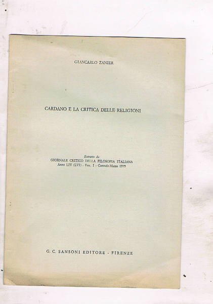 Cardano e la critica delle religioni. Estratto. | Libri antichi e moderni | Zanier Giancarlo.