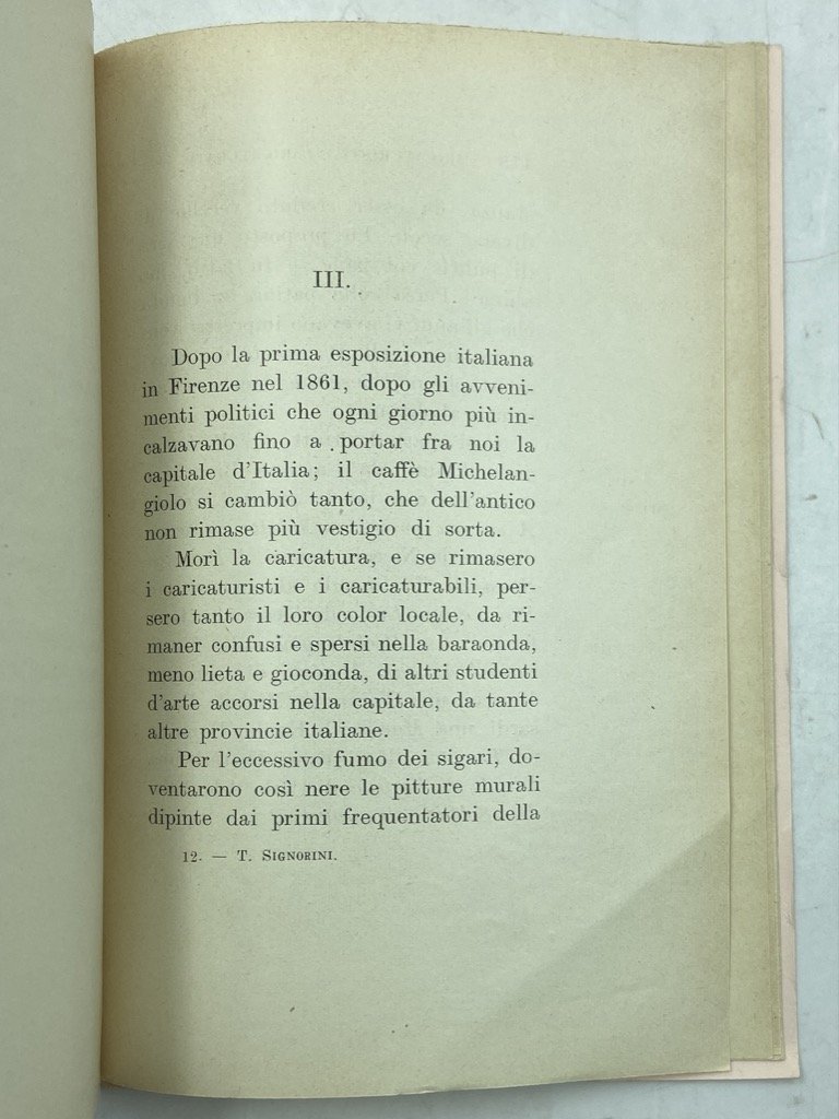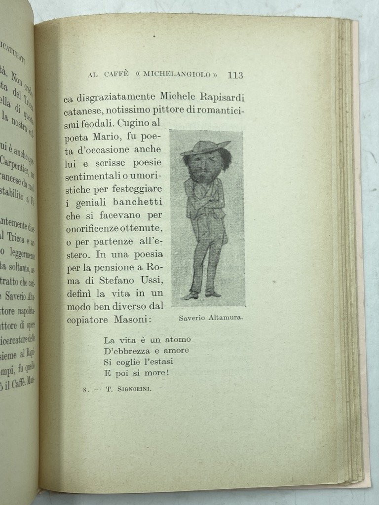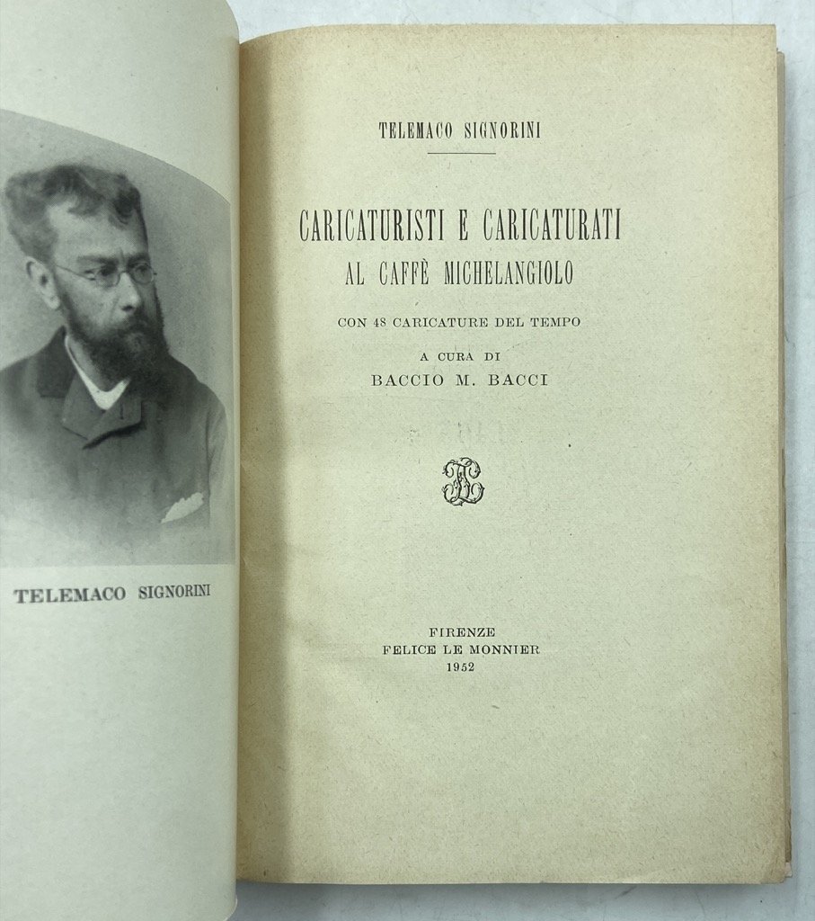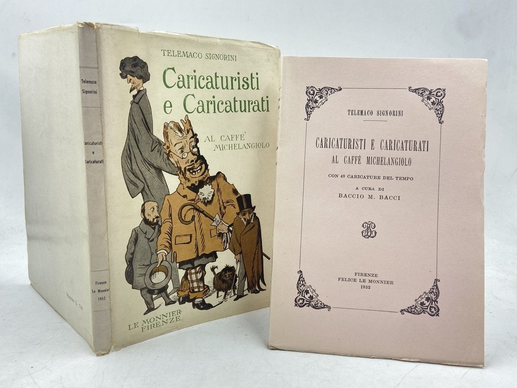 Brossura editoriale con sovraccoperta illustrata, cm 17 x 12, pp 196 (4), ritratto all’antiporta e 48 figure in nero. Buon esemplare. Ricordi del pittore macchiaiolo sull’ambiente artistico fiorentino e le animate serate del Caffè Michelangiolo, con le caricature, in gran parte opera di Angiolo Tricca, esposte alla Società degli Artisti all'epoca. Seconda edizione, pubblicata oltre mezzo secolo dopo l’originale del 1893 con l’aggiunta di una lunga introduzione di Baccio M. Bacci e del ritratto dell’autore; tutte in nero le illustrazioni, anche le poche originariamente a colori.