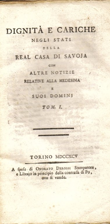 Cariche del Piemonte e paesi uniti colla serie cronologica delle persone che le hanno occupate ed altre notizie di nuda istoria dal fine del secolo decimo sino al dicembre 1798. Con qualche aggiunta relativa anche al tempo posteriore - Dignità e cariche negli Stati della Real Casa di Savoia con altre notizie relative alla medesima e suoi domini