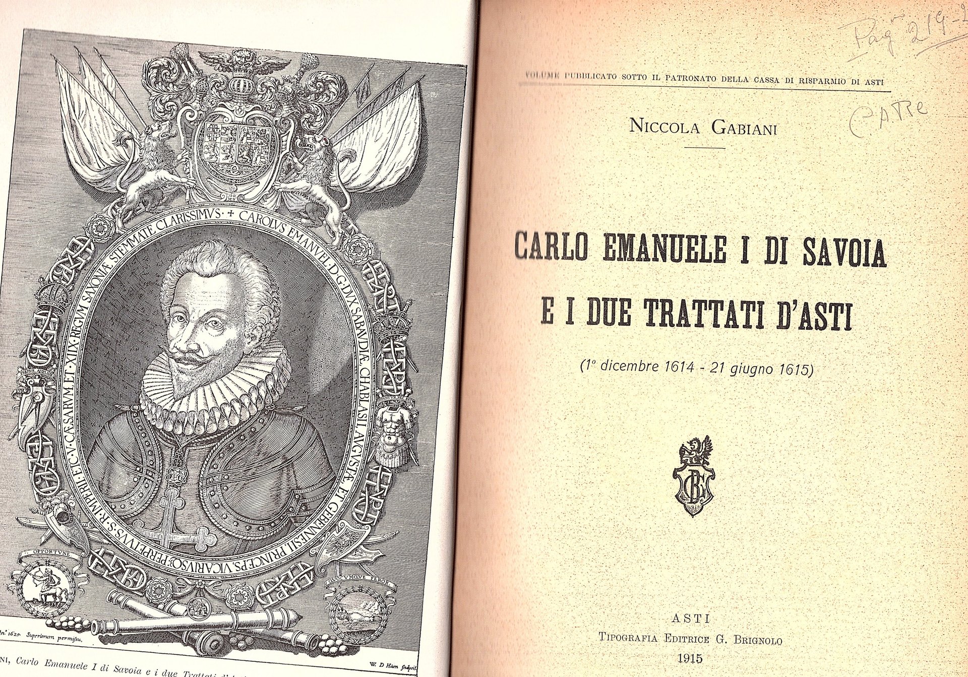 In-8°, pp. XI, 244, (1), In fine, una topografia ripiegata delle campagne militari in Monferrato, nell'Astigiano e in Piemonte negli anni 1613-1618. Antiporta con ritratto di Carlo Emanuele I tratto da un'antica stampa. Legatura posteriore in tela mattone con titolo su tassello Edizione originale, pubblicata sotto il patronato della Cassa di Risparmio di Asti. Appendice di documenti alle pp. 261 e sgg. Niccola Gabiani (Asti, 1858-ivi, 1940) fu uno dei maggiori storici della città di Asti, autore di numerosissimi ed eruditi contributi sempre fedeli ad un vaglio estremamente rigoroso delle fonti. Manca a Borghezio, Bibliografia Piemontese-Ligure.