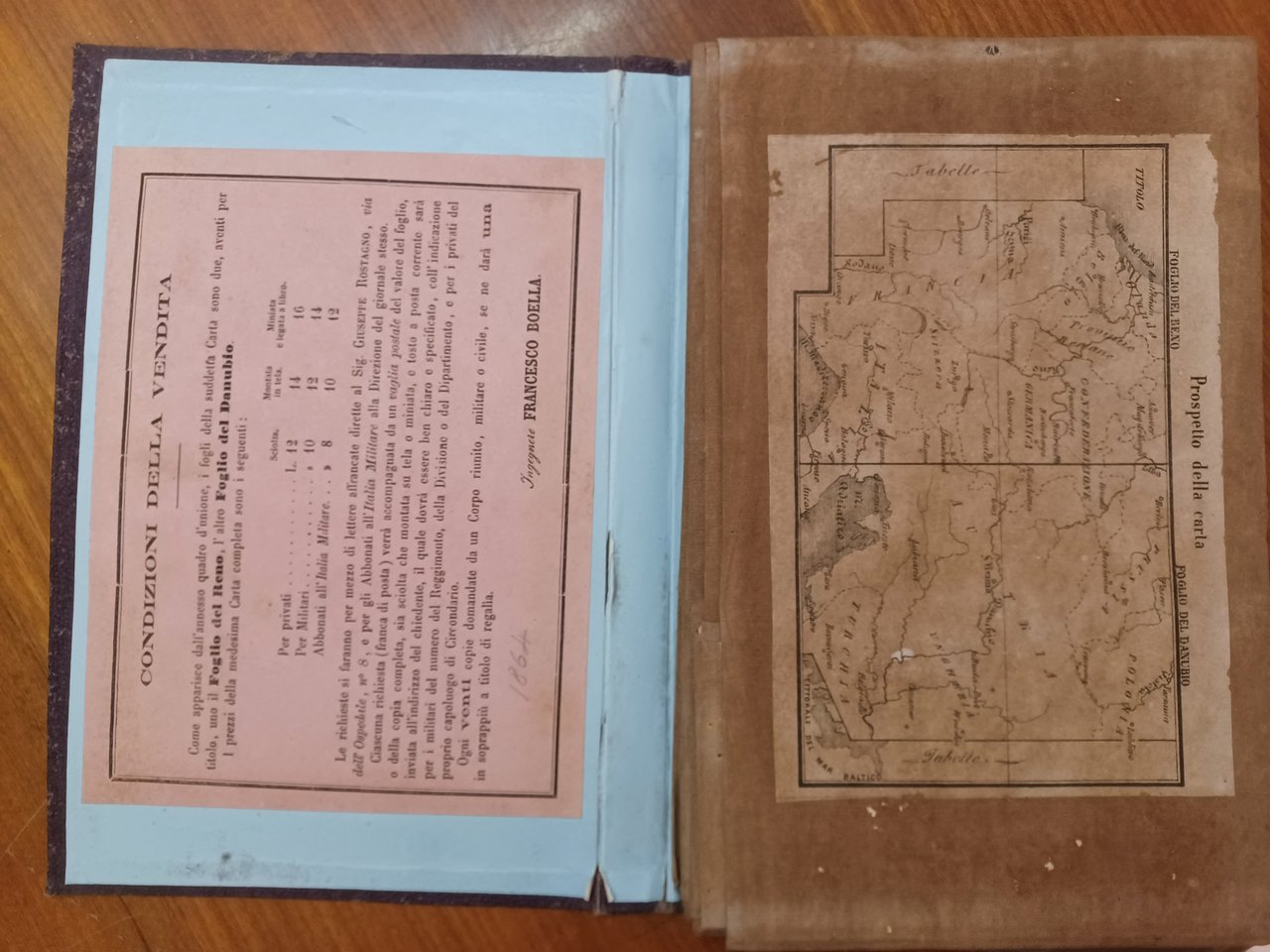 1864. Copertina tela editoriale con titoli al piatto. Carta geografica del Danubio (cm. 86,5 x 76), inc. in rame e colorata a mano, montata su tela, suddivisa in 30 riquadri. Tabella statistica / Nomenclatura diversa di alcune città e in basso, cartina a colori del Littorale tedesco russo del Mare Baltico, con i segni convenzionali e le scale. Lievi segni del tempo. Condizioni molto buone