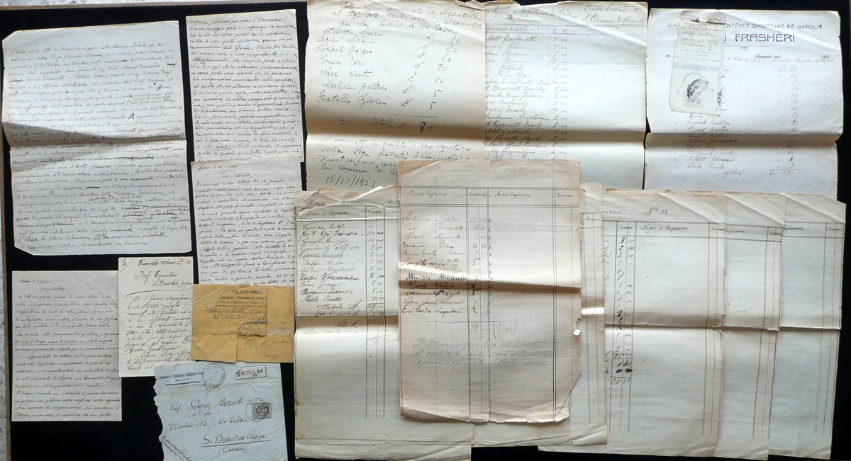 Carteggio, Sottoscrizioni per l'erezione di monumento - lapide a memoria del De Rada con accluse alcune lettere di corredo a tale attività Anni '20 del Novecento Carteggio costituito da vari fogli di sottoscrizione, da alcune lettere manoscritte, da una cartolina postale, da un telegramma tutti relativi alla raccolta fondi e alla realizzazione di un monumento - lapide commemorativa a memoria del De Rada; formato vario (vedi foto). Condizioni di conservazione Carteggio in condizioni più che discrete con tracce d'uso, pieghe di conservazione, alcune lievi ingialliture della carta e tracce di sporco; margini e angoli di alcune pagine con piccoli strappetti, pieghette / tracce di pieghette. Poche piccole / minime mancanze. SC03.D15099 N