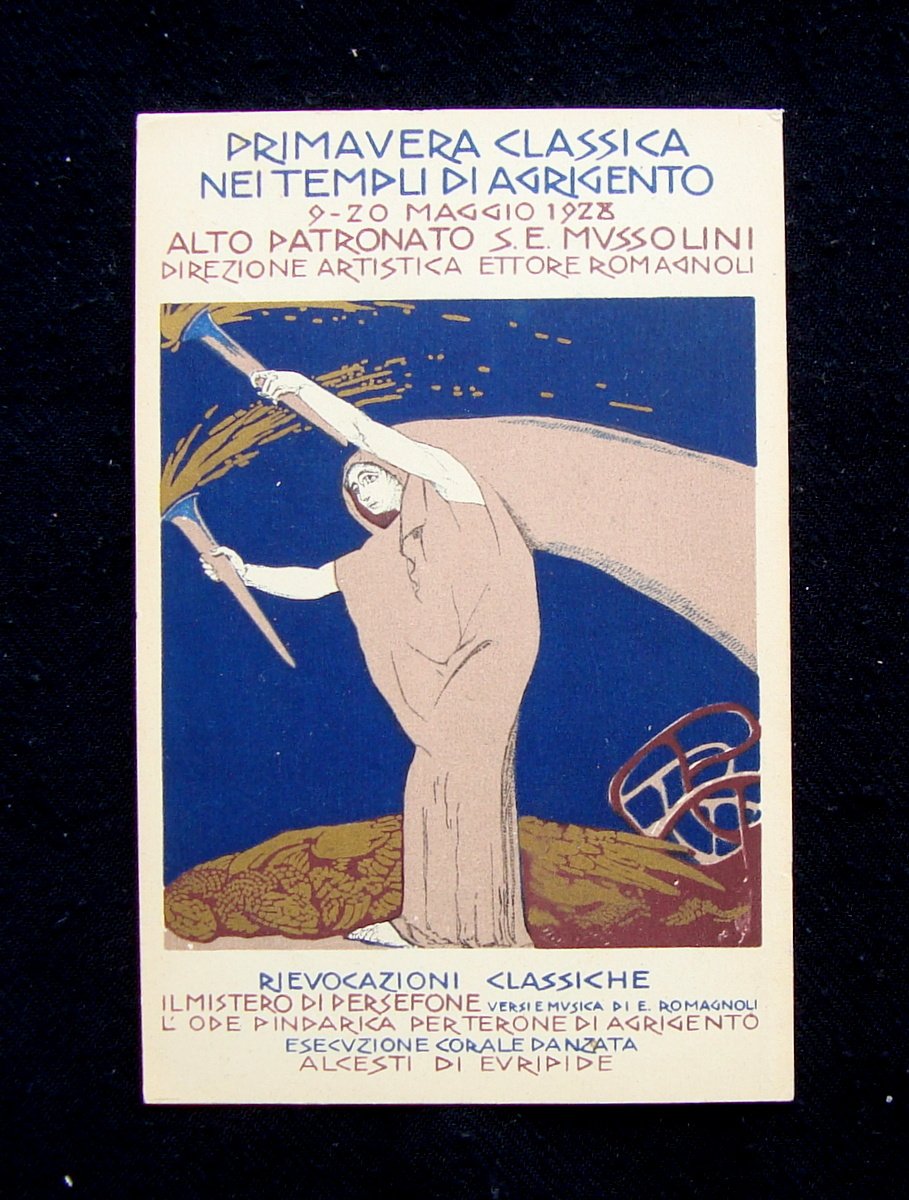 Cartolina, Primavera Classica nei Templi di Agrigento 9 - 20 Maggio 1928 Rievocazioni Classiche Guazzoni, roma; 1928; cm 14x9; cartolina illustrata bella grafica e stampa in litografia, formato piccolo; non viaggiata. RARA Condizioni di conservazione Esemplare in buono stato; leggere bruniture; per condizioni vedi foto. CART.1996 blu