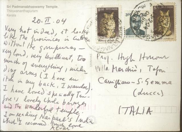 Cartolina compilata in inglese, a firma "Alvar", inviata dall'India in data 20 febbraio 2004, contenente brevi impressioni del viaggio nel Kerala dello storico dell'arte cubano. Codice libreria 173037.
