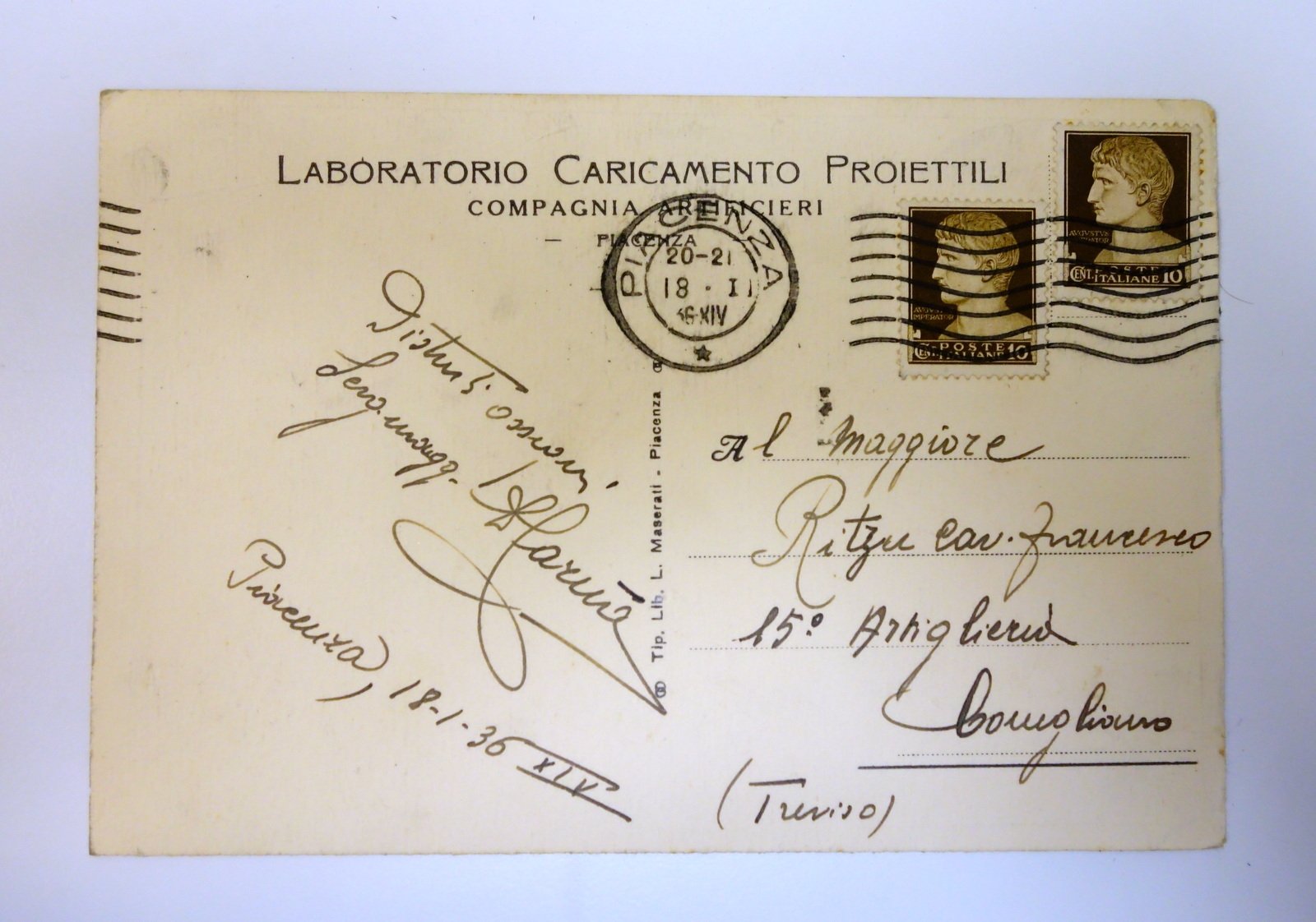 Cartolina Laboratorio Caricamento Proiettili Compagnia Artiglieri viaggiata 1936