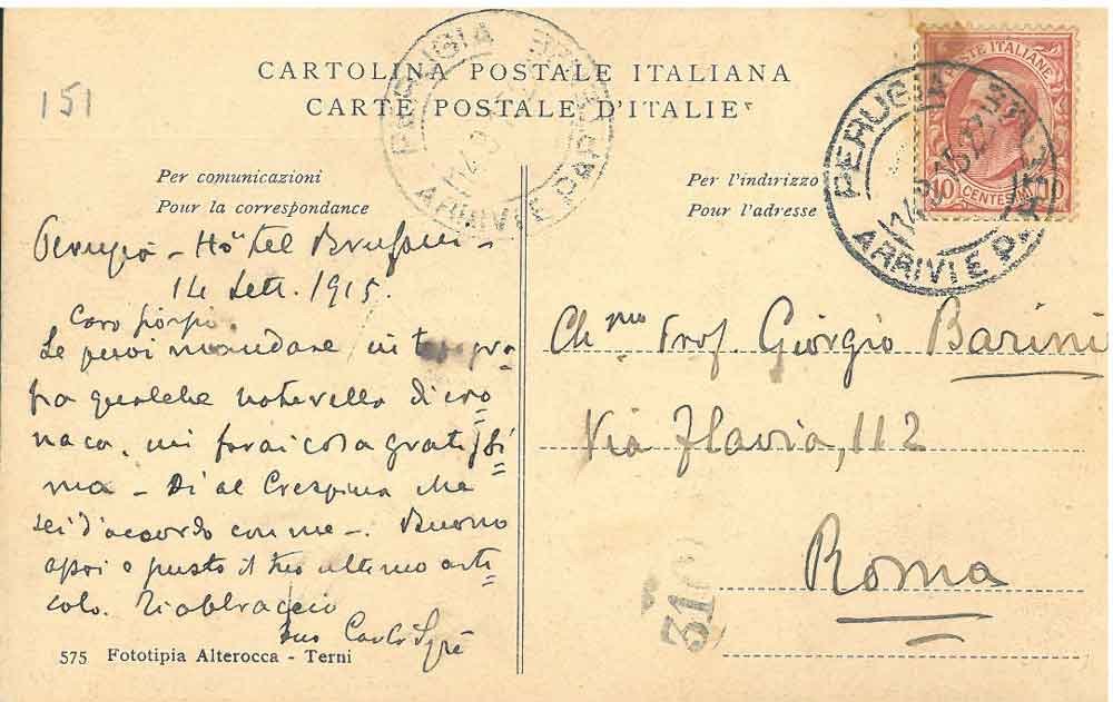 Cartolina postale illustrata: "Perugia: Brufani's Grand Hotel" e viaggiata: Perugia, 14.9.15 | Libri antichi e moderni | Segré, Carlo (1867-?)