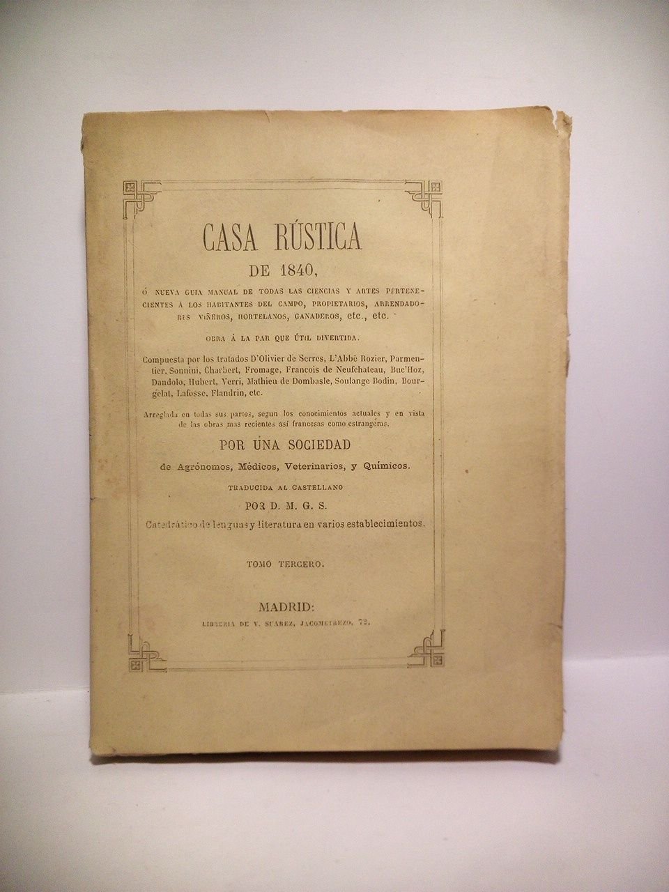Casa Rústica de 1840, ó nueva guía manual de todas la ciencias y artes pertenecientes a los habitantes del campo, propietarios, arrendadores, viñeros, hortelanos, ganaderos, etc., etc. Obra a la par que util divertida / Compuesta por los tratados D'Olivier de Serres, L'Abbe Rozier, Parmentier, Sonnini, Chabert, Fromage, Francois de Neufchateau, Buc'Hoz, Dandolo, Hubert, Verri, Mathieu nde Dombasle, Soulange Bodin, Bourgelat, Lafosse, Flandrin, etc. Arreglada en todas sus partes, según los conocimientos actuales y en vista de las obras más recientes así francesas como estrangeras, por., traducidas al castellano por D. M. G. S., Catedrático de lenguas y literatura en varios establecimientos