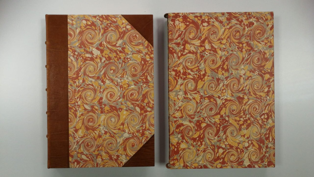 Legatura d'artista in mezza pelle marrone, dorso a 5 nervi con fregi in oro e titolo in oro, piatti marmorizzati e angoli in pelle, taglio in testa dorato, cofanetto rigido con stessa carta dei piatti.