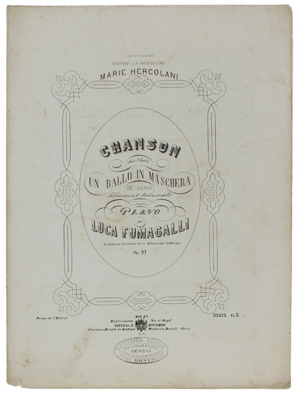 CHANSON dans l'Opera UN BALLO IN MASCHERA de Verdi librement transcrite pour piano op. 27 [spartito] | Libri antichi e moderni | Fumagalli Luca.