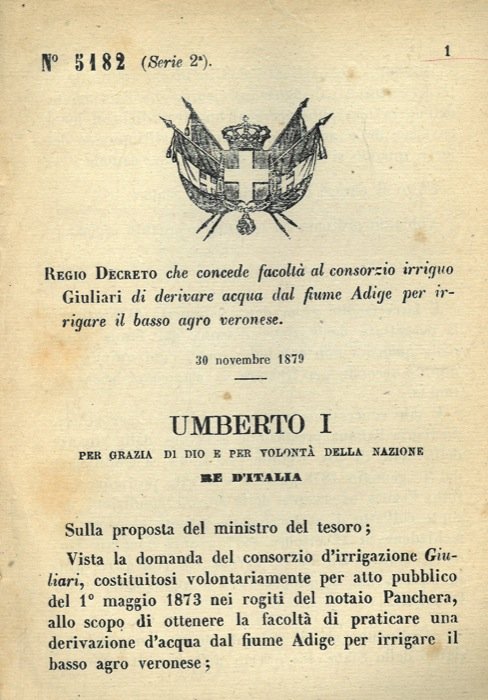 che concede facoltà al consorzio irriguo Giuliari di derivare acqua dal fiume Adige per irrigare il basso agro veronese. | Libri antichi e moderni | Regio Decreto