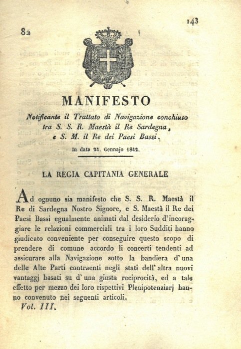 che notifica il Trattato di Navigazione concluso tra il re e il sovrano dei Paesi Bassi. | Libri antichi e moderni | Manifesto