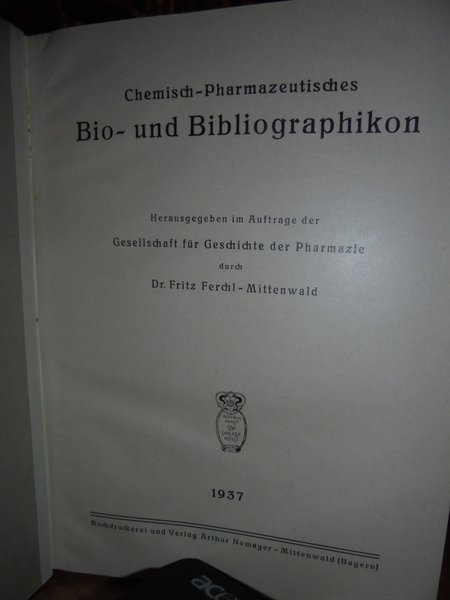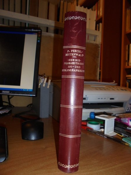 Ferchl-Mittenwald, Dr. Fritz. Arthur Nemayer. Mittenwald, Germany, 1937 (Bayern). Chemisch-Pharmazeutisches Bio- und Bibliographikon. Herausgegeben im Auftrage der Gesellschaft für Geschichte der Pharmazie. In-8°, m. pelle con fregi e titoli in oro al dorso, brossure originali conservate. (2), 603 pp. con testo su due colonne. Perfetto esemplare in legatura recente con le copertine originali conservate. Uff. D - III - 4