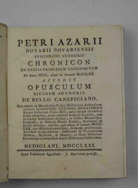 Chronicon de Gestis Principum Vicecomitum ab anno MDDL usque ad Annum MCCCLXX. Accedit Opusculum ejusdem Authoris De Bello Canepiciano. Quae omnia ex Manuscripto Codice Bibliothecae Ambrosianae ediderat Ludovicus Antonius Muratorius. | Libri antichi e moderni | Azario Pietro.