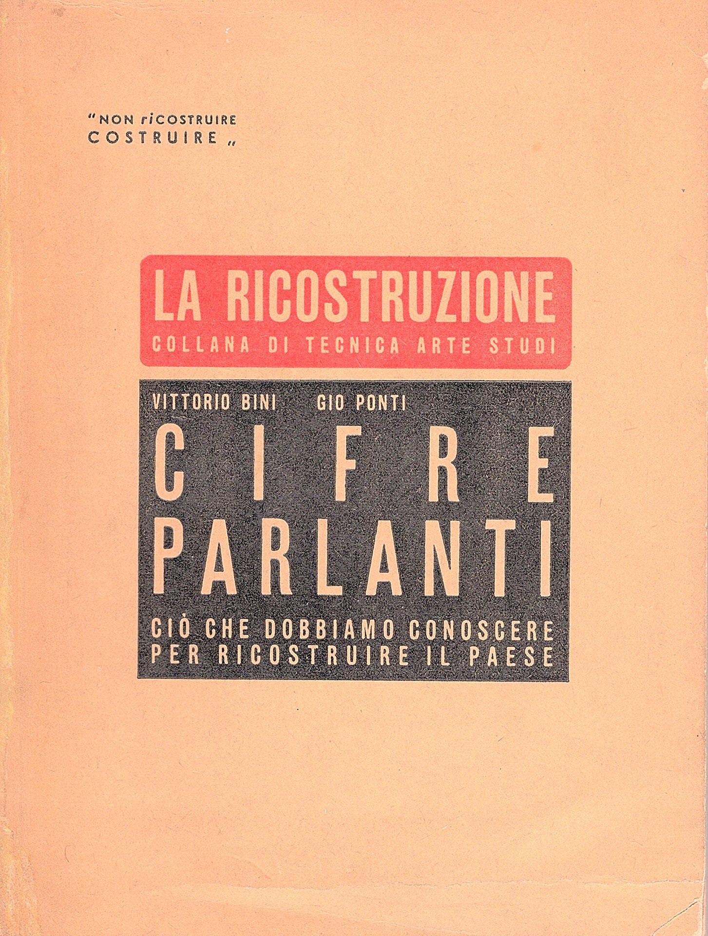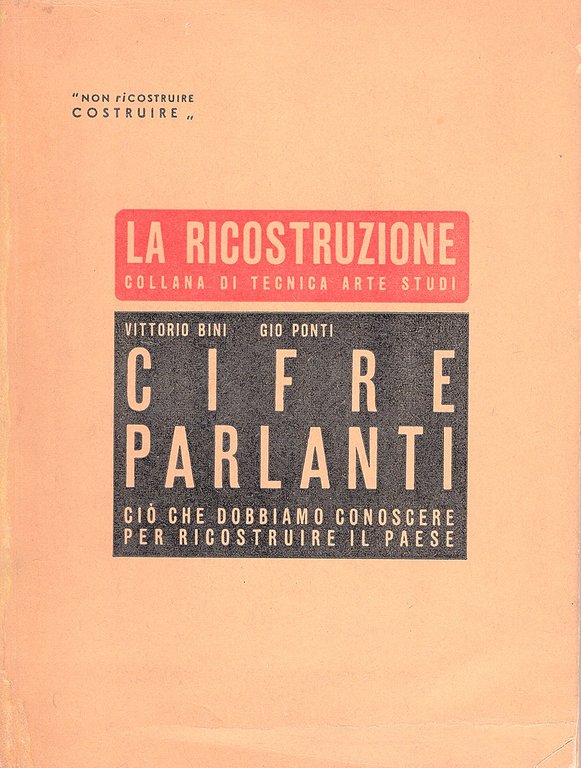 In-16° (19,5x14,5 cm), pp.107 (5), brossura editoriale con titoli in bianco al piatto anteriore entro moduli grafici rossi e neri. 7 illustrazioni originali b/n nel testo. Progetto editoriale di Gio Ponti.Collana La Ricostruzione, 1. Restauri conservativi e minimamente integrativi al dorso e al contropiatto posteriore, pagine lievemente brunite ai margini. Più che buon esemplare. Seconda non comune edizione identica alla più rara prima del 15 luglio esaurita in due mesi. 'Le case si dovranno costruire in serie come le automobili? Non diciamo che automobili e case debbano somigliarsi: ma soltanto che noi dovremo «montare» sul posto il più possibile di elementi di casa, costruiti in serie: che l'industria si deve impadronire della fabbricazione di questi elementi, che il pubblico «deve» esigere che la casa sia «prefabbricata» il più possibile'. Cfr. Biblioteca del Moderno. Arte e architettura nei libri dalla Sezession alla Pop Art», Lugano, Fondazione Galleria Gottardo, 199: p. 44;