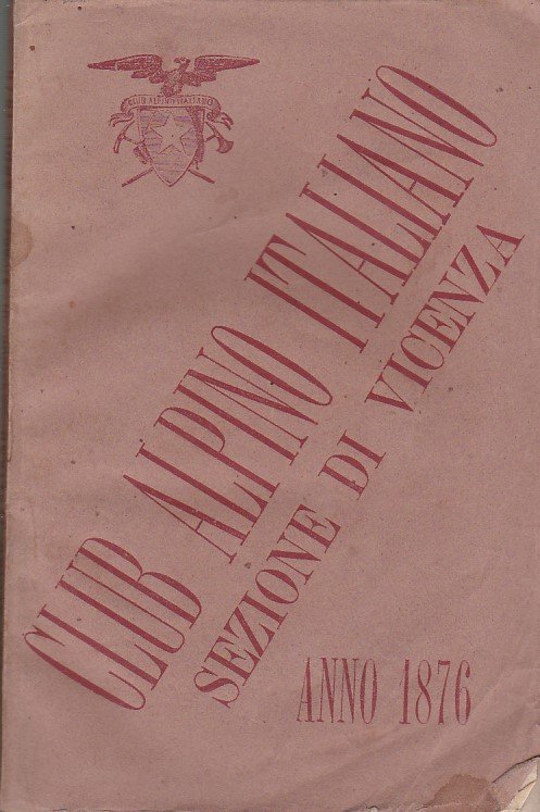 In-16°, pp. (4), 178, (2), brossura editoriale con titolo e stemma del C.A.I. in rosso. Ottimo stato. Scritto introduttivo di Scipione Cainer. Contributi di vari autori (Francesco Cusani, Almerico da Schio, ecc.) relativi ai seguenti argomenti e località: il Summano, la Cima di Posta, i Lessini, la Valle dell'Astico, le Giudicarie, le Valli di Brenta e del Piave, ecc. In fine, elenco di soci della Sezione di Vicenza per il 1876.