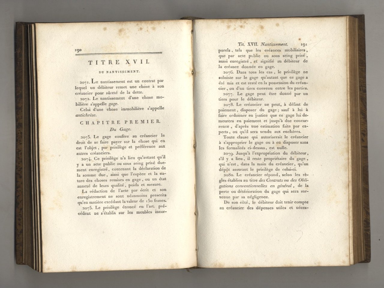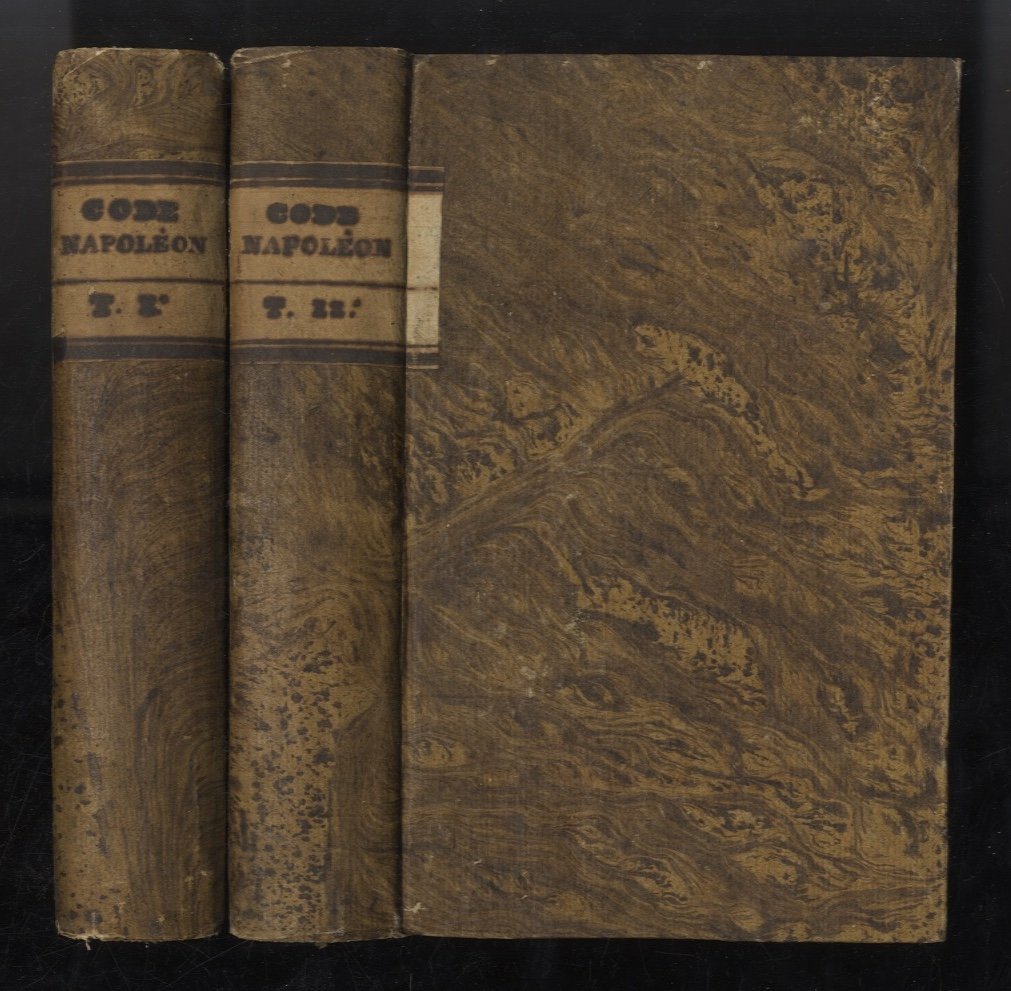 Milan, de l'Impimerie et Fonderie de J.J. Destefanis, 1805, volumi 2, in-8, legatura coeva in cartone radicato (imitante una pelle), tasselli in carta con titolo manoscritto ai dorsi, tagli dorati, nastrini segnapagine, pp. [4], 324 - [4], 322. Si tratta di una delle primissime e rare edizioni del Codice Napoleonico stampate sul suolo italico, precedente alla prima traduzione in lingua italiana (e alla fattiva adozione in Italia) del 1806. Salvo lievi e fisiologiche fioriture e qualche minimo difetto esterno, l'esemplare è in ottimo stato. Solo 3 esemplari censiti in ICCU (ultimo accesso 31/07/2025).