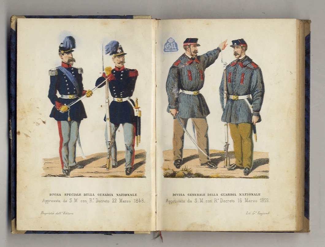 Torino, Tip. Nazionale di G. Biancardi, 1859, in-16, mezza pergamena coeva, piatti marmorizzati, titolo manoscritto al dorso, pp. XIV, (3), 18-412, (4). Con 2 tavole a colori in cromolitografia (Lit. G. Reycend) raffiguranti 4 soldati in uniforme. Blande bruniture dovute al tipo di carta usato. Ottime condizioni.